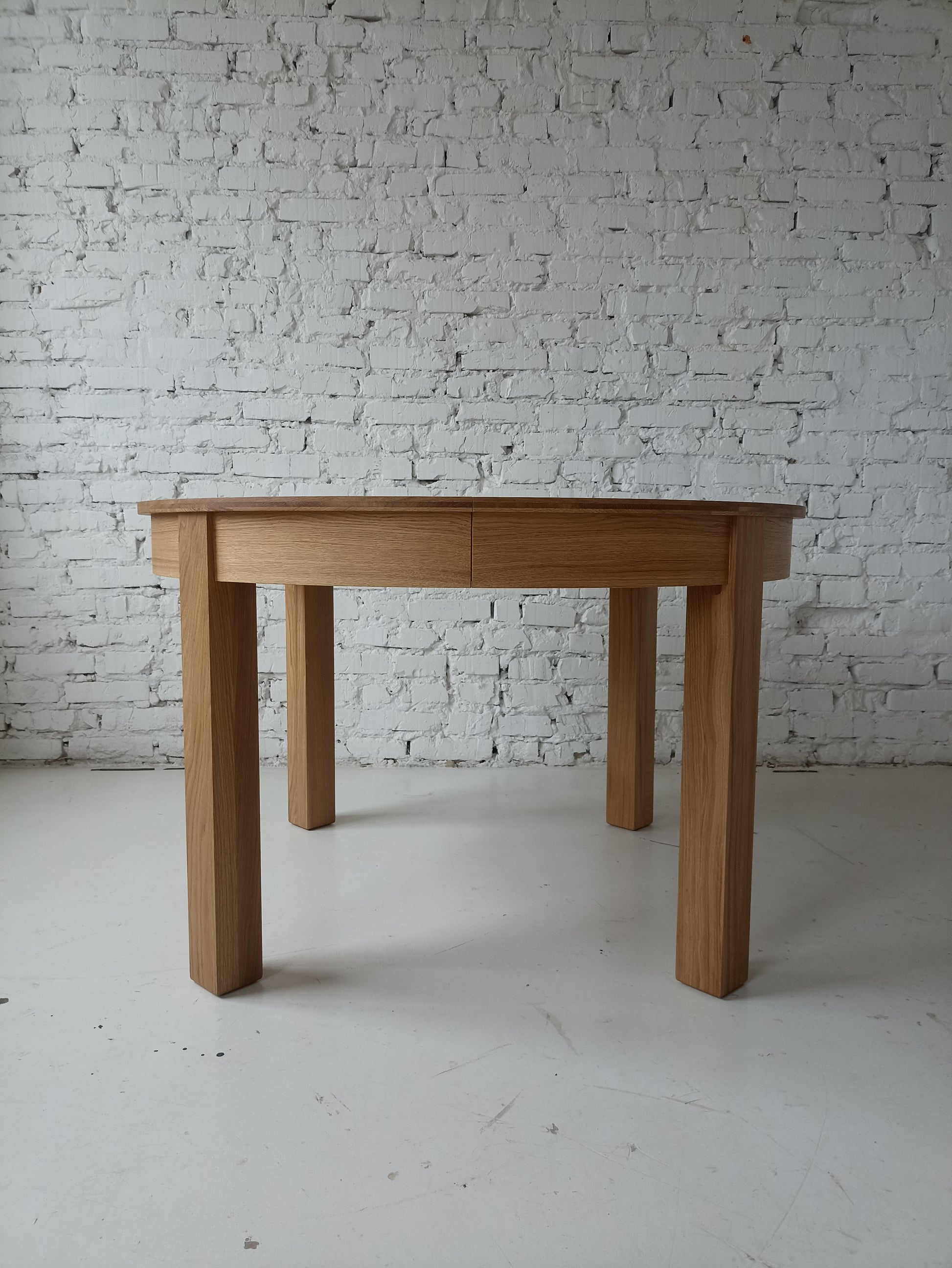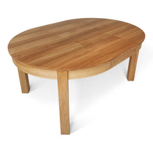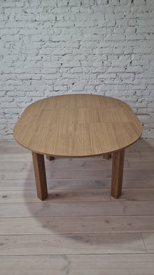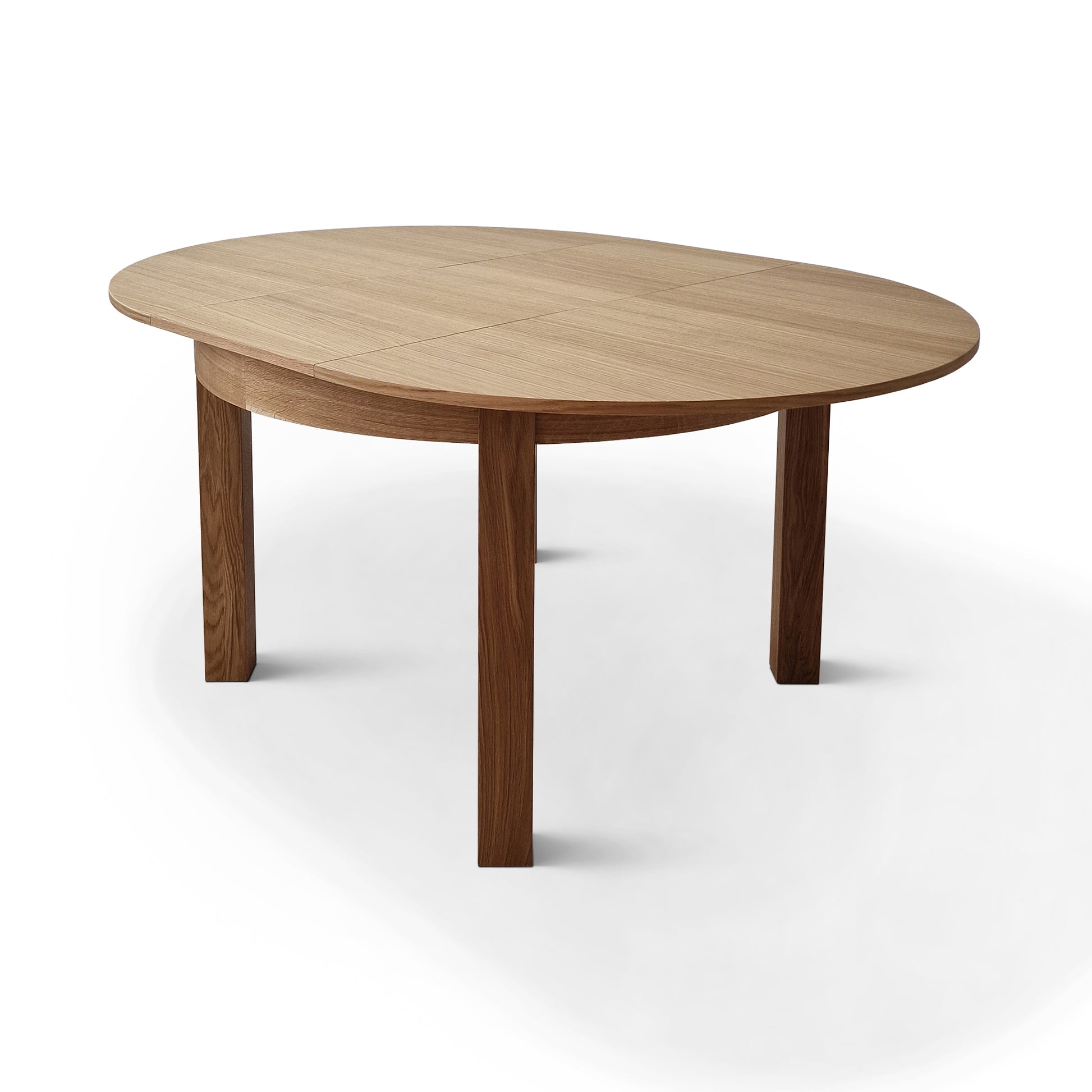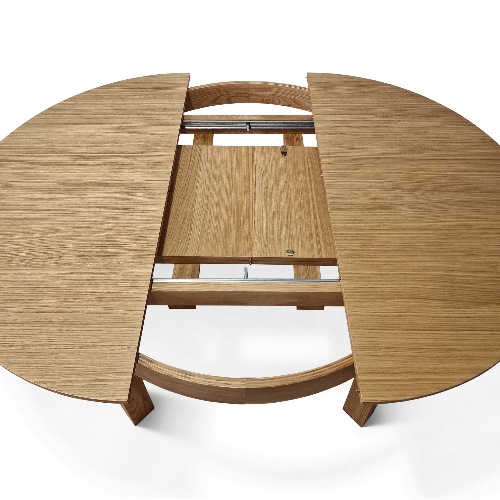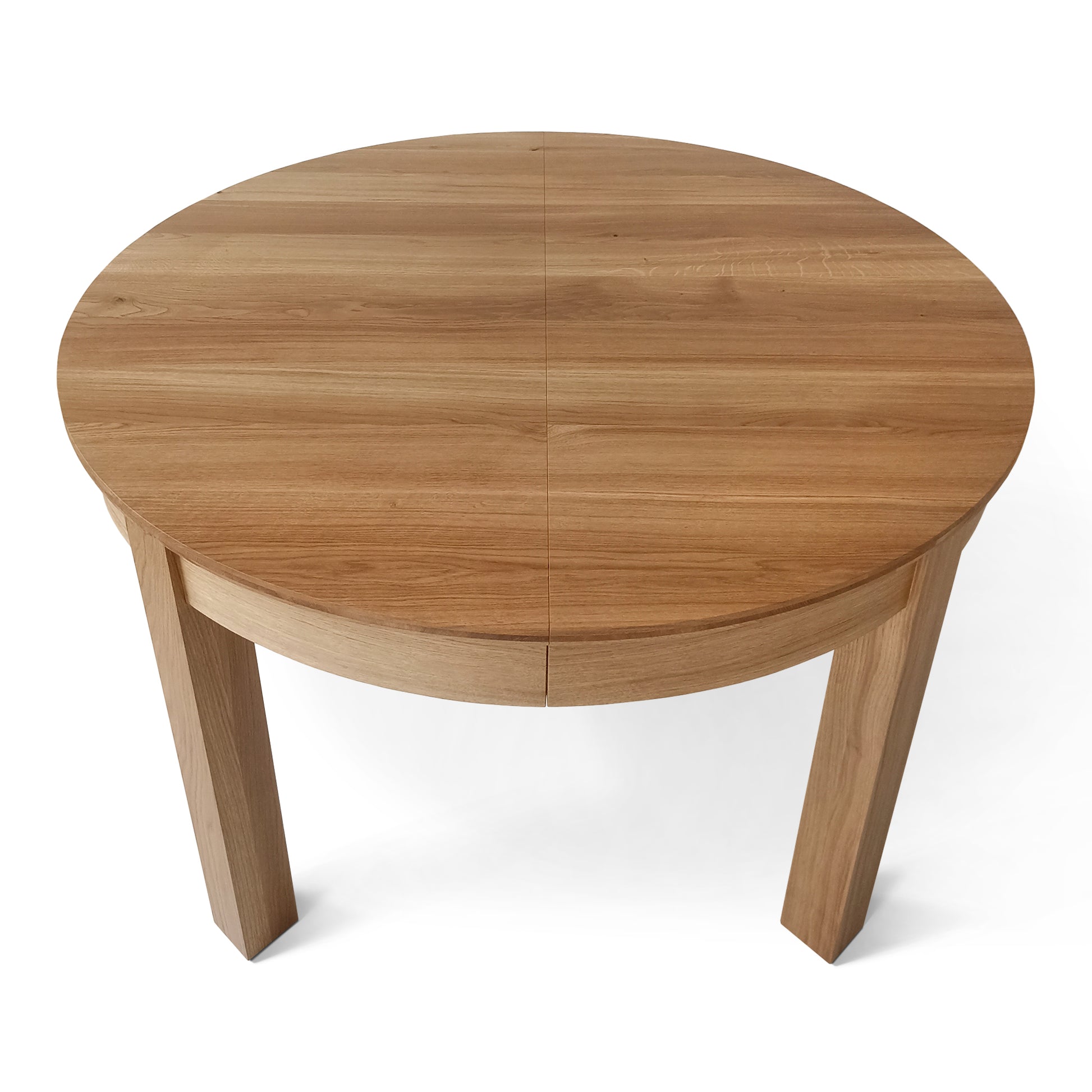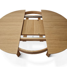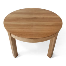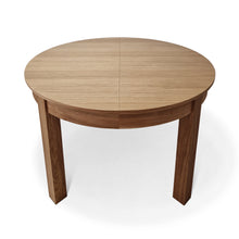 La versión extensible de la mesa de comedor de roble redondo viene con una hoja adicional, que permite un 4 asientos adicionales (con una extensión de 1x45 cm) o 6 asientos (con extensiones de 2x45 cm). La extensión se almacena convenientemente dentro de la mesa.