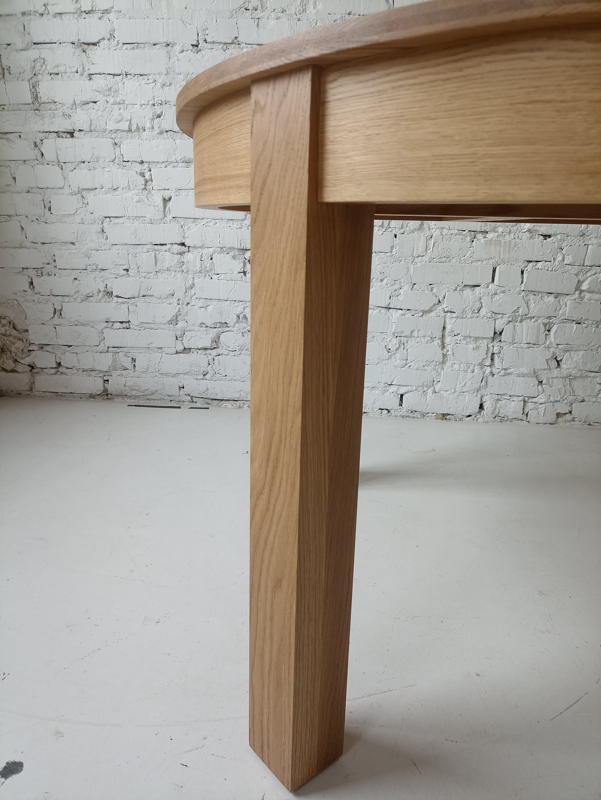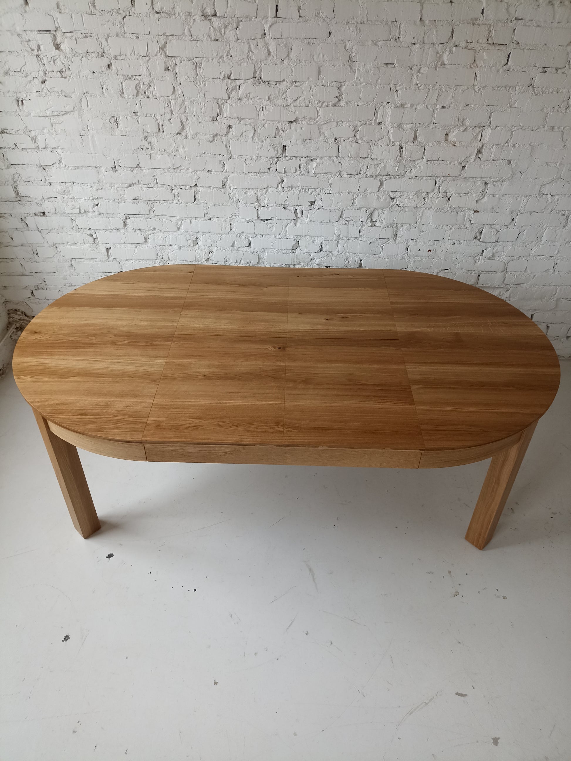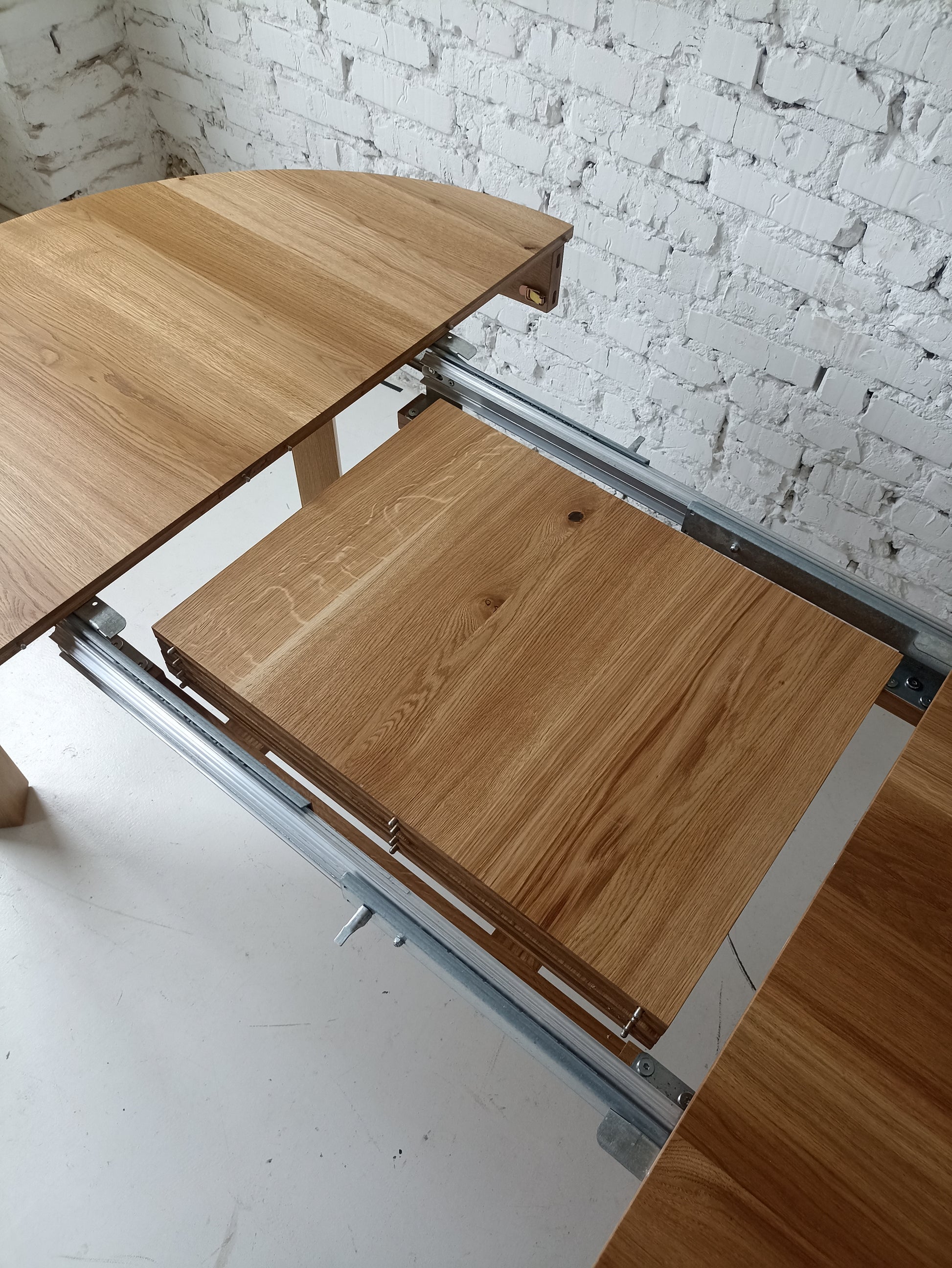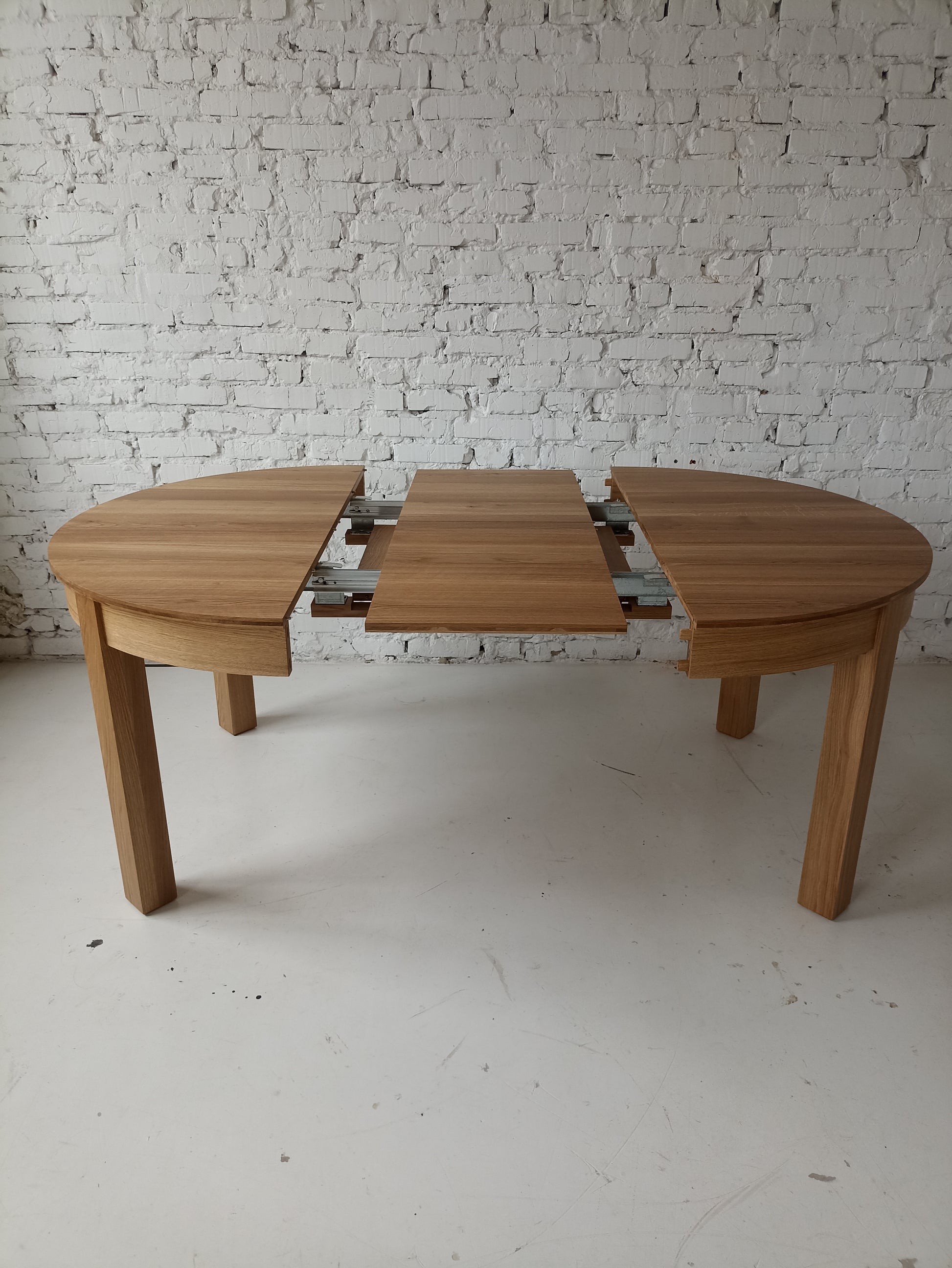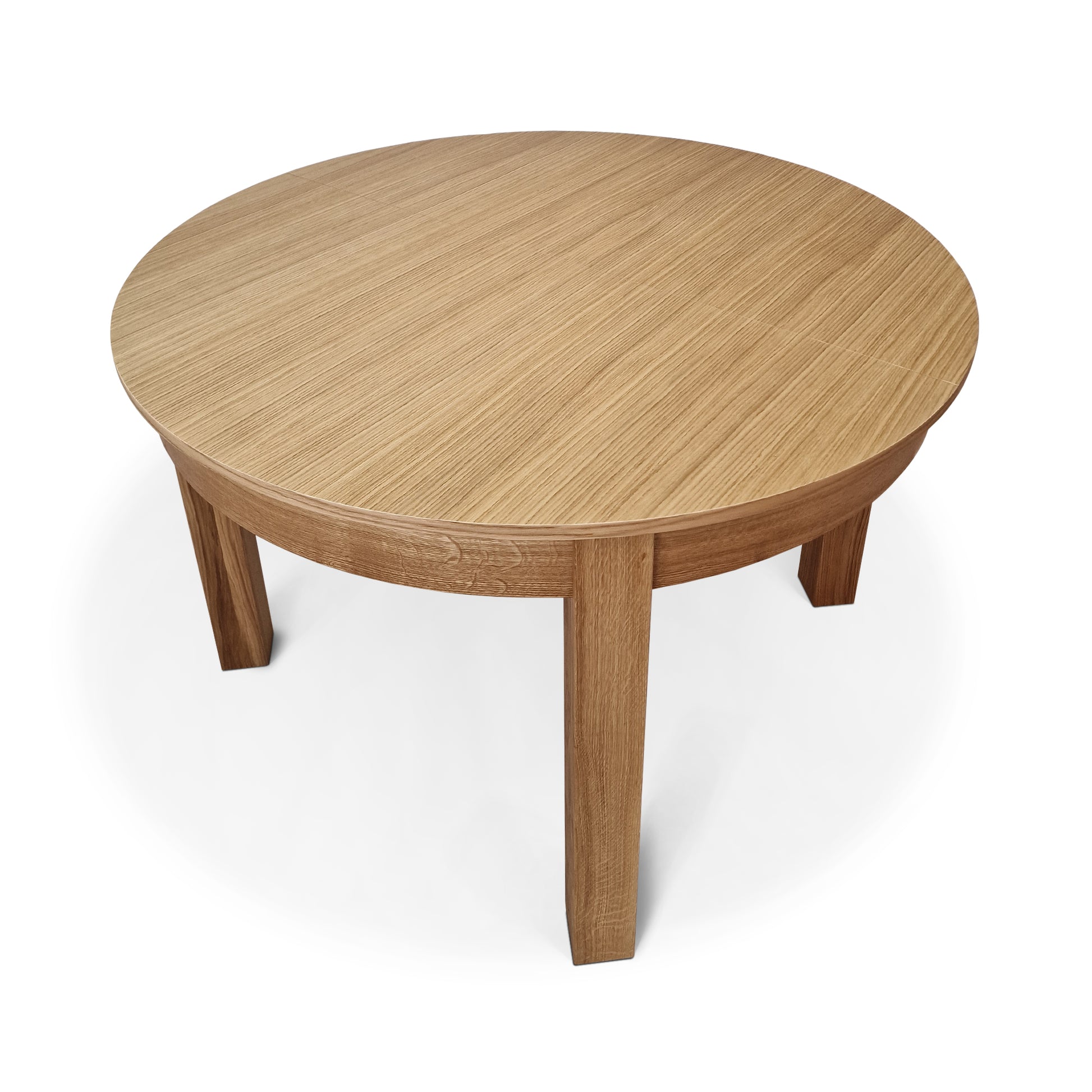 La versión extensible de la mesa de comedor de roble redondo viene con una hoja adicional, que permite un 4 asientos adicionales (con una extensión de 1x45 cm) o 6 asientos (con extensiones de 2x45 cm). La extensión se almacena convenientemente dentro de la mesa.